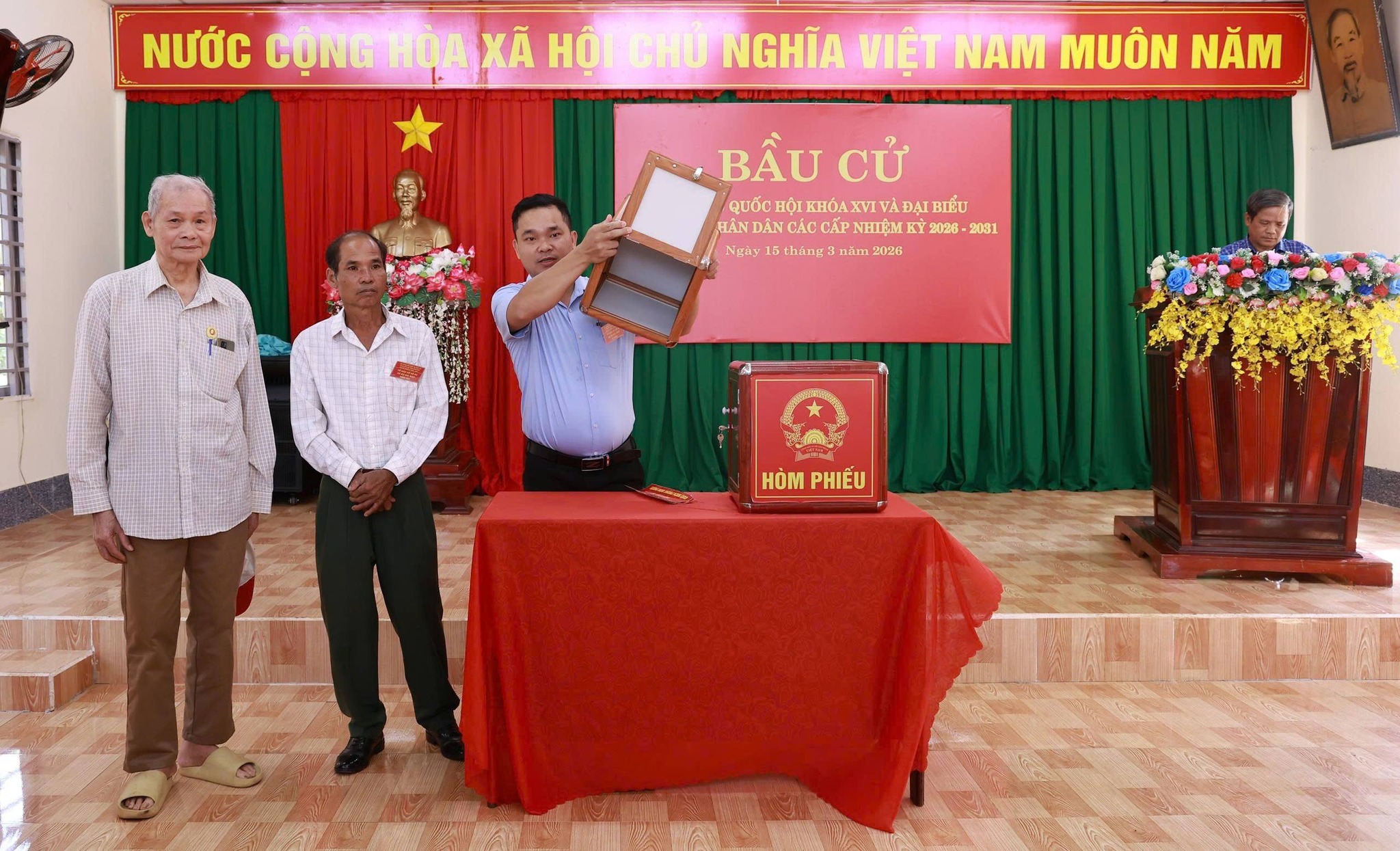 Tiếp đó, Tổ bầu cử tiến hành kiểm tra hòm phiếu trước sự chứng kiến của cử tri, bảo đảm tính công khai, minh bạch; sau khi kiểm tra và niêm phong hòm phiếu, các thành viên Tổ bầu cử thực hiện quy trình phát phiếu bầu, hướng dẫn cử tri ghi phiếu và bỏ phiếu đúng quy định.