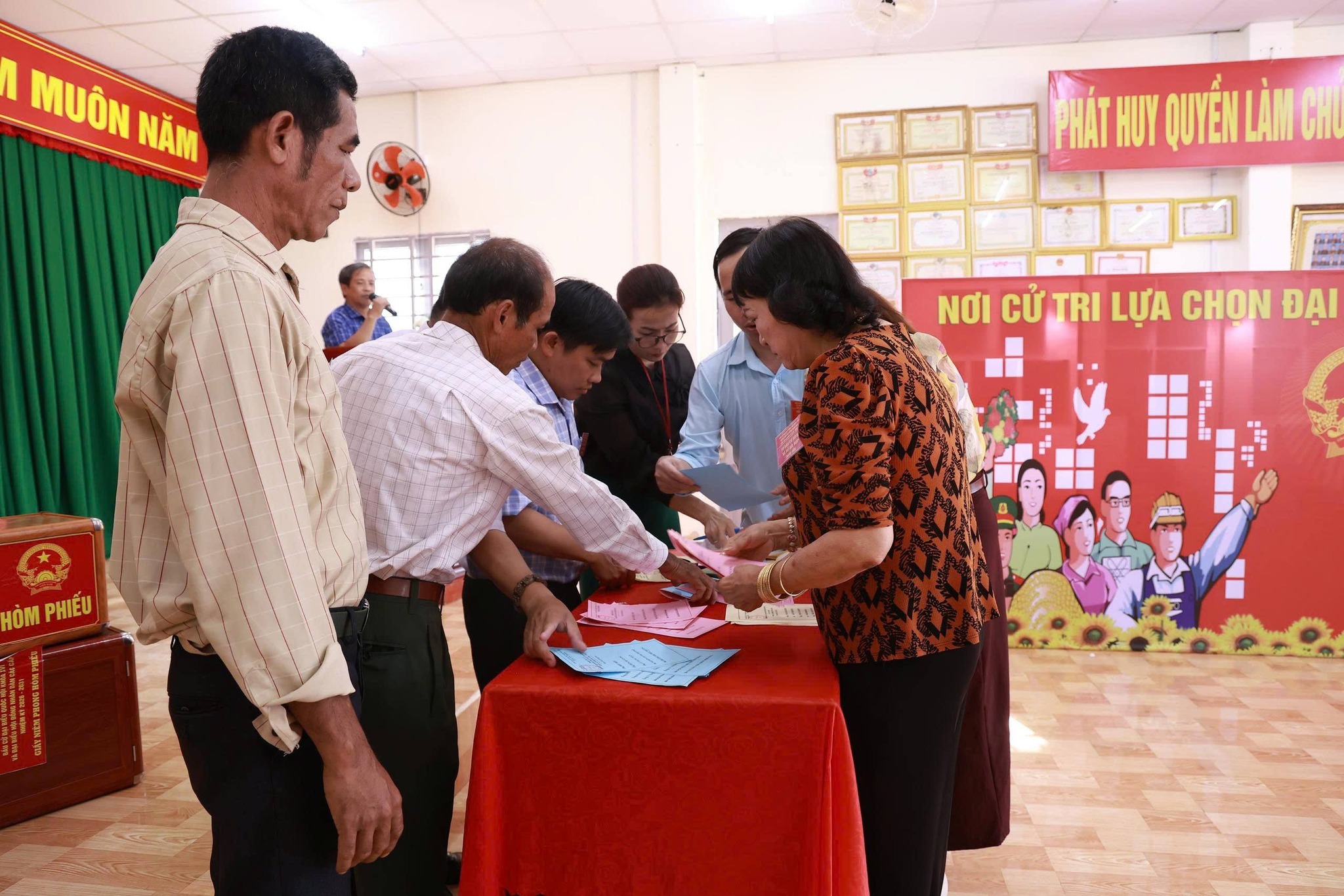 Tiếp đó, Tổ bầu cử tiến hành kiểm tra hòm phiếu trước sự chứng kiến của cử tri, bảo đảm tính công khai, minh bạch; sau khi kiểm tra và niêm phong hòm phiếu, các thành viên Tổ bầu cử thực hiện quy trình phát phiếu bầu, hướng dẫn cử tri ghi phiếu và bỏ phiếu đúng quy định.<br />