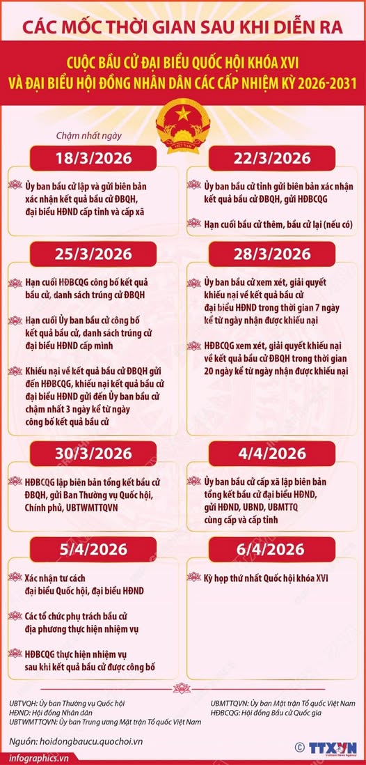 <div style="text-align: justify;">Ngày 15/3/2026, cử tri cả nước đã đi bầu cử đại biểu Quốc hội khóa XVI và đại biểu Hội đồng nhân dân các cấp nhiệm kỳ 2026-2031, lựa chọn những người tiêu biểu, xứng đáng, đại diện cho ý chí, nguyện vọng và quyền làm chủ của nhân dân. Sau ngày bầu cử, Hội đồng Bầu cử Quốc gia và Ủy ban Bầu cử các địa phương tiếp tục triển khai nhiều công việc quan trọng để hoàn tất quy trình bầu cử theo đúng quy định của pháp luật, đảm bảo kết quả phản ánh trung thực ý chí và nguyện vọng của cử tri.<br />