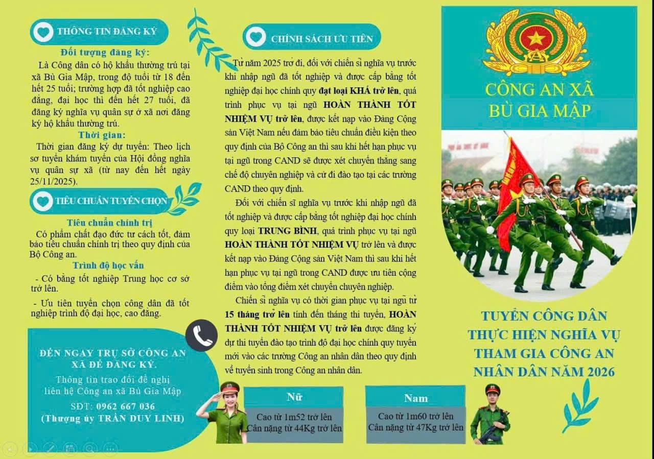 Công an xã Bù Gia Mập thông báo tuyển công dân thực hiện nghĩa vụ tham gia công an nhân dân năm 2026
