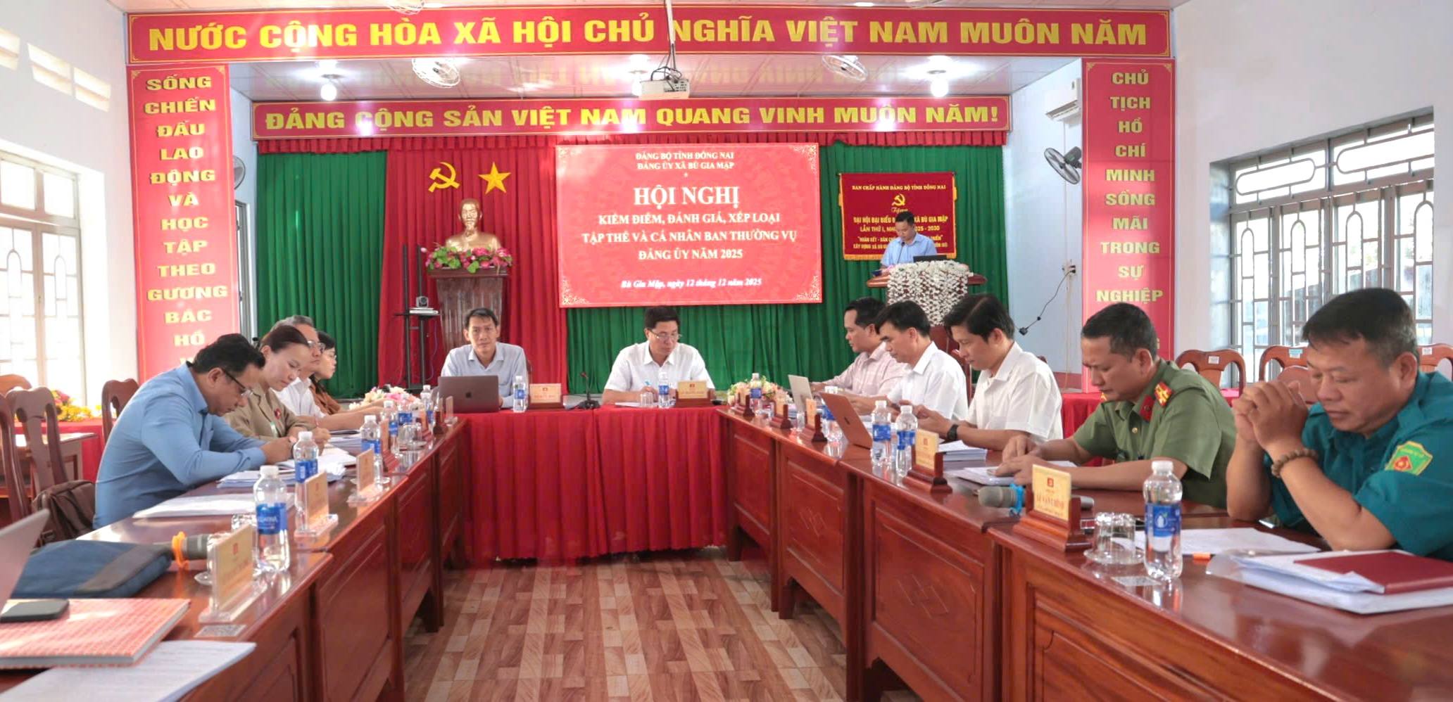 Sáng ngày 12/12/2025, tại Hội trường xã Bù Gia Mập, Ban Thường vụ Đảng ủy xã Bù Gia Mập tổ chức Hội nghị kiểm điểm và đánh giá, xếp loại chất lượng đối với tập thể, cá nhân Ban Thường vụ Đảng ủy năm 2025 theo Quy định số 84-QĐ/TU ngày 24/11/2025 của Ban Thường vụ Tỉnh ủy và Quy định số 26-QĐ/ĐU ngày 28/11/2025 của Ban Thường vụ Đảng ủy xã về kiểm điểm, đánh giá, xếp loại chất lượng đối với tập thể, cá nhân trong hệ thống chính trị.